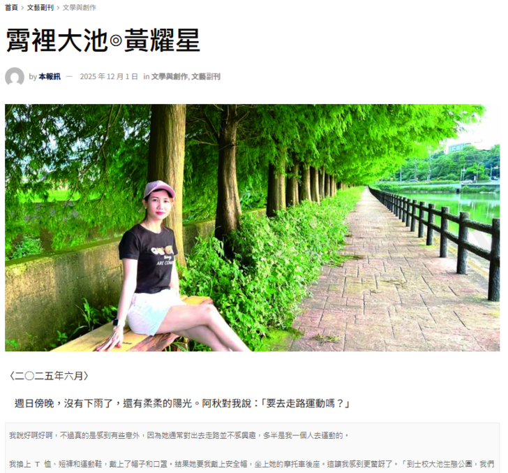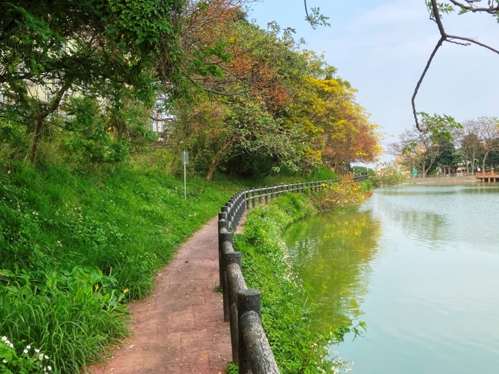 我就這樣專心的為阿秋拍照,一直到她歡歡喜喜的說,要離開了,我才作罷。我上了她的摩托車,她把車子開到了龍東路。我以為她是要去買便當,因為已經是晚餐的時間了。結果她把我帶到了士校大池生態公園。原來,是她「良心發現」,因為她原本是說,要跟我出來走路運動的嘛。