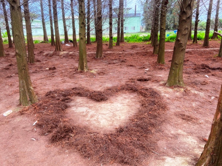 進入樹林後,我才發現裡面已有許多年輕男女,在樹林裡面拍照和取景。有的年輕女士在搔首弄姿,有的男人則在耍酷。我看到林間有人用掉到地上的枯枝落葉,擺成了一個大大的心形。我也不能免俗的拍了幾張照片。