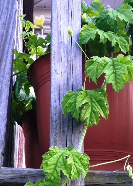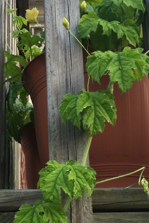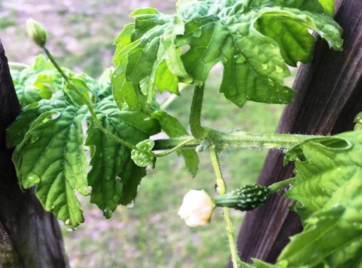 苦瓜的藤蔓攀附著陽臺的木欄,還有一些苦瓜的小花苞。