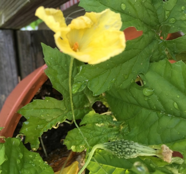 前幾天,我發現陽臺上有一盆苦瓜苗,開出了第一朵淡淡的小黃花,在細雨中楚楚動人,帶給了我一個小小的驚喜。今天傍晚,在落日餘暉中,我不僅又看到了幾個小花苞和已開放的花朵,還發現已經結了兩個非常秀氣的小苦瓜,那更是帶給了我意外的驚喜,因為我沒有預期能那麼快就可以看到結果。我想,這兩條目前和姆指差不多大的苦瓜,一定是在我沒有留意的時候就已經開花了。