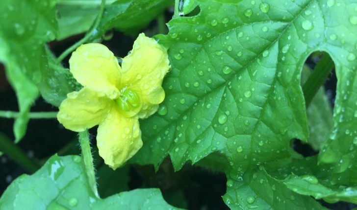 五月二十九日,一朵在細雨中楚楚動人的苦瓜小黃花。