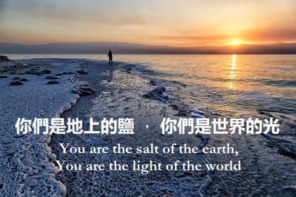 昨天主日證道:聖經記載耶穌使用的一個比喻:「你們是世上的鹽。鹽若失了味,怎能叫它再鹹呢?以後無用,不過丟在外面,被人踐踏了。你們是世上的光。城造在山上是不能隱藏的。人點燈,不放在鬥底下,是放在燈臺上,就照亮一家的人。你們的光也當這樣照在人前,叫他們看見你們的好行為,便將榮耀歸給你們在天上的父。」(馬太福音5:13-16)