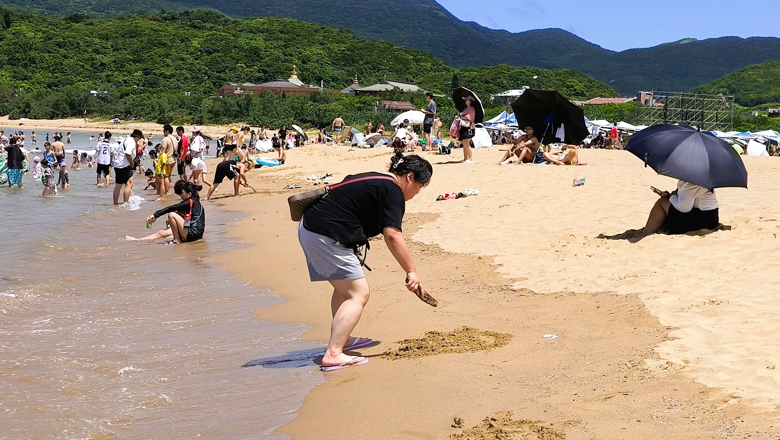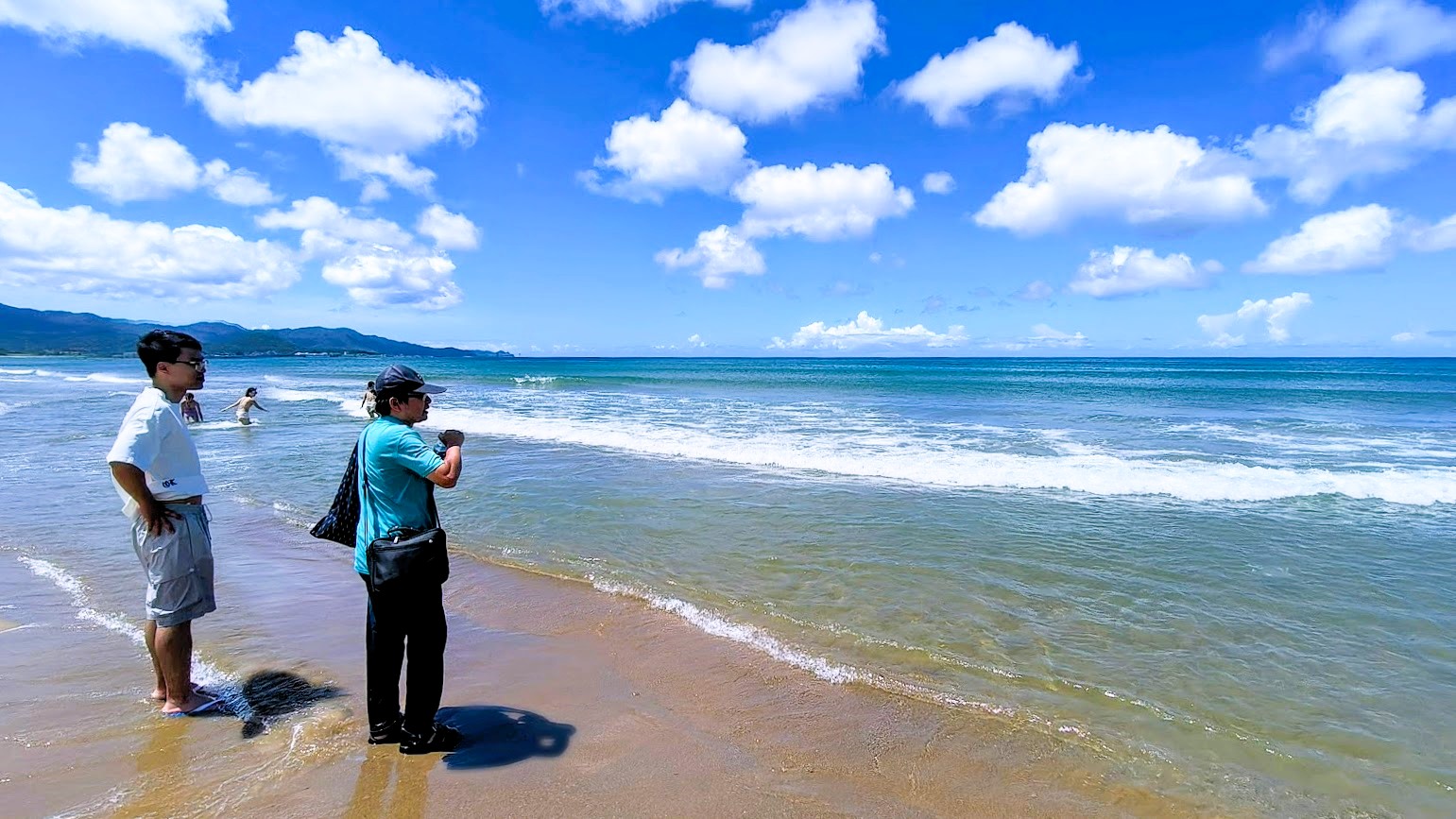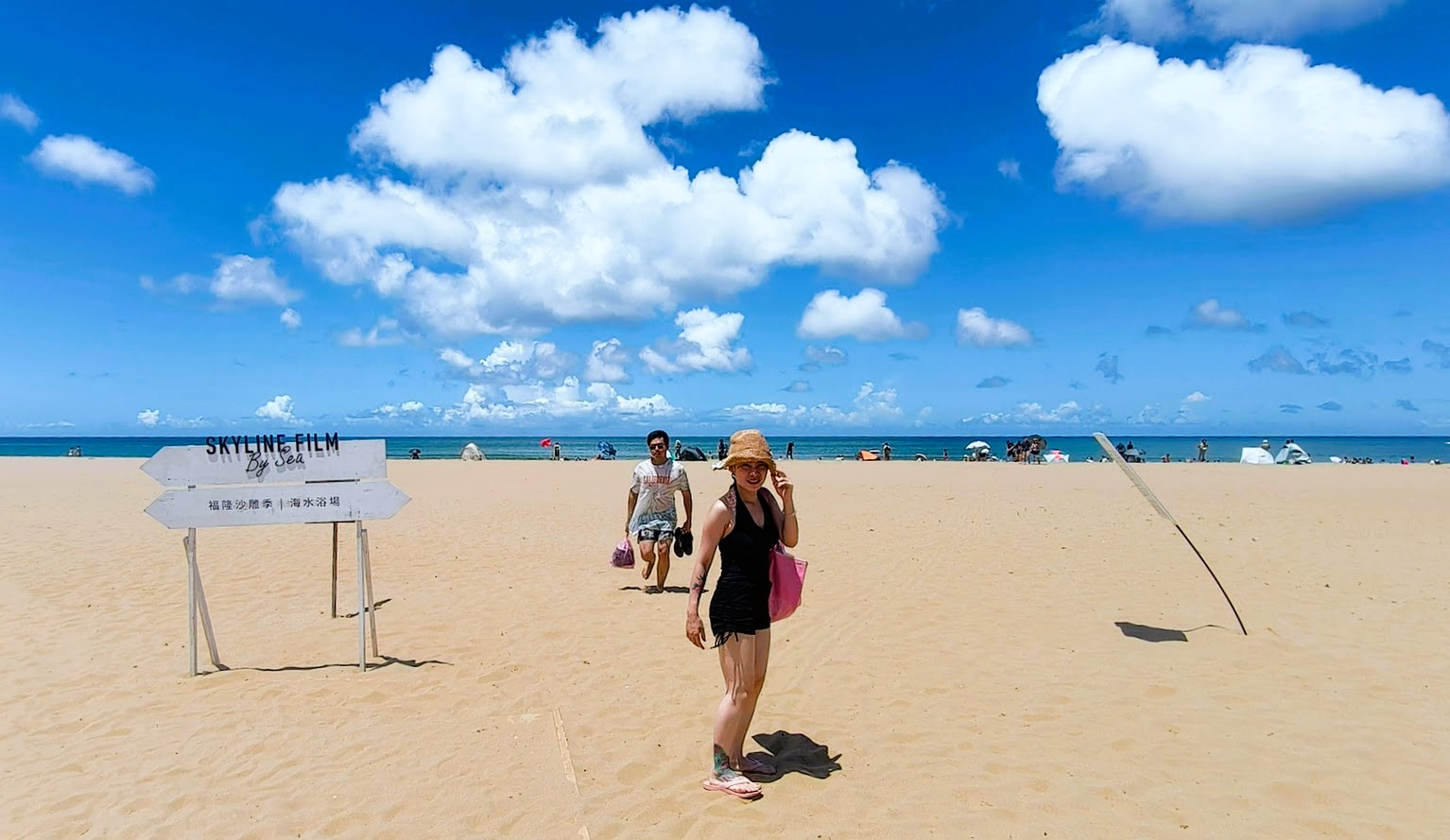 中午時分,我們搭火車前往福隆。一下車就感受到濱海的鹹濕海風。海水浴場裡滿是踏浪戲水的遊客,我們換上涼鞋踩進沙裡,感受太陽下炙熱卻自由的海岸氣息。