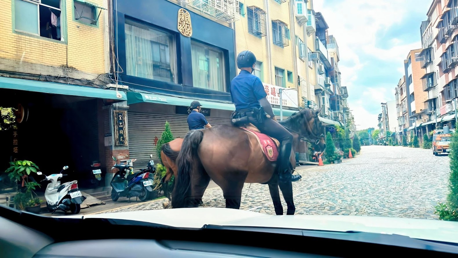隔天早上九點,開車來接親友,在旅館外面遇到騎馬的警察,帥氣的身影以為置身歐洲~