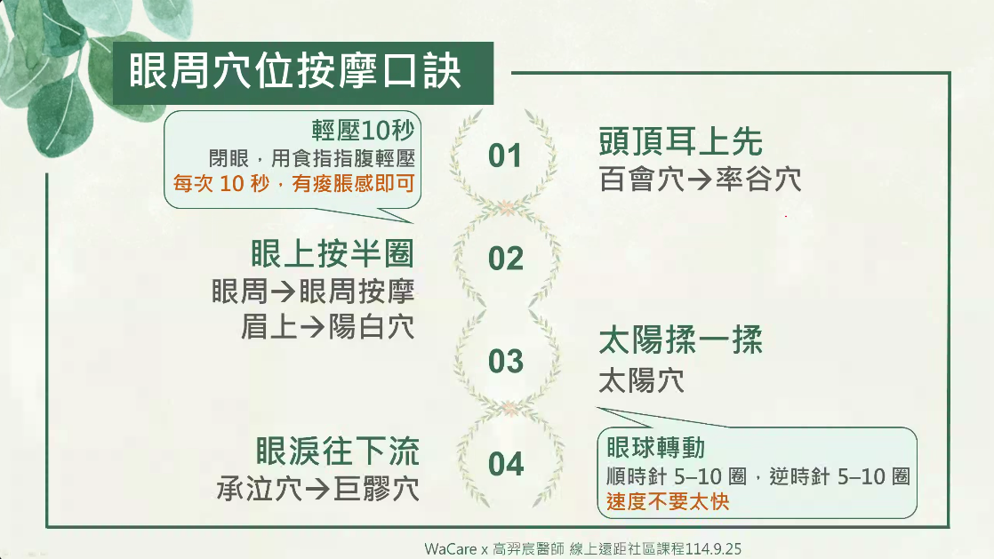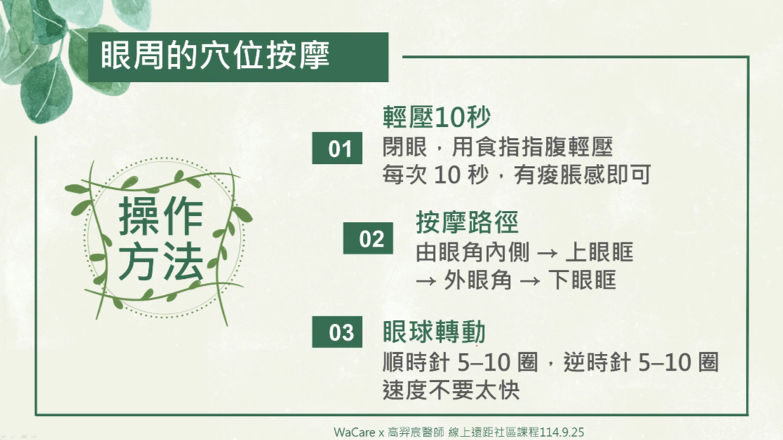 - 輕壓10秒:閉眼→用食指指腹輕壓→每次10秒→痠脹感即可