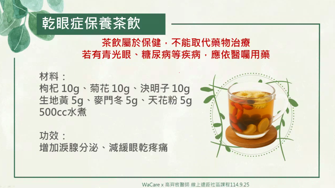 - 材料:枸杞10g、菊花10g、決明子10g、生地黃5g、麥門冬5g、天花粉5g,500cc水煮
