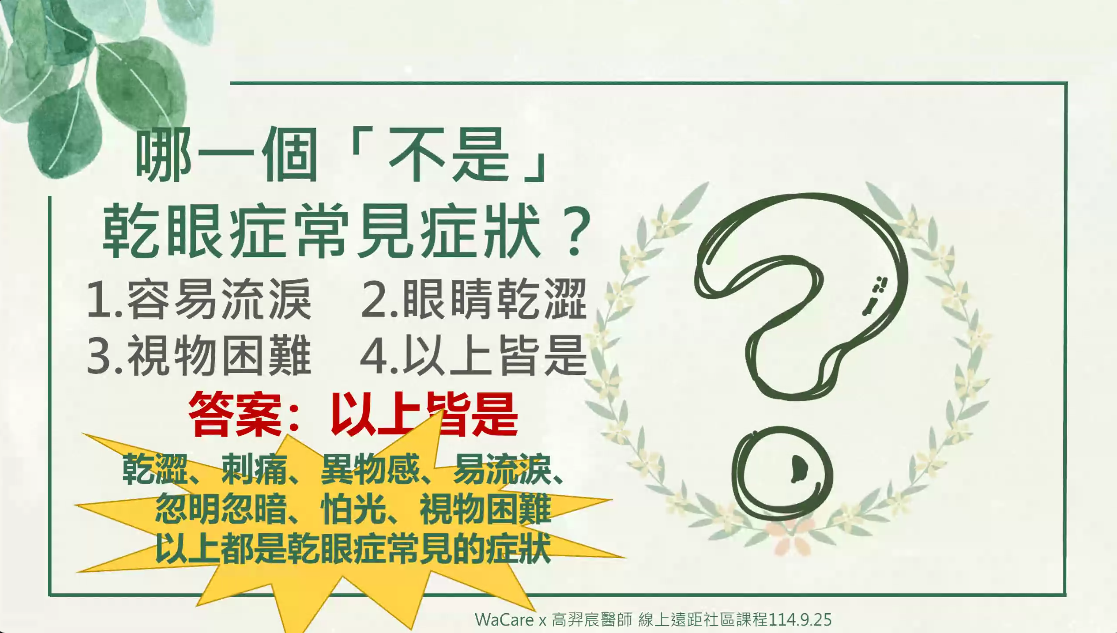 - 乾澀、刺痛、異物感,好像有沙子在眼睛裡