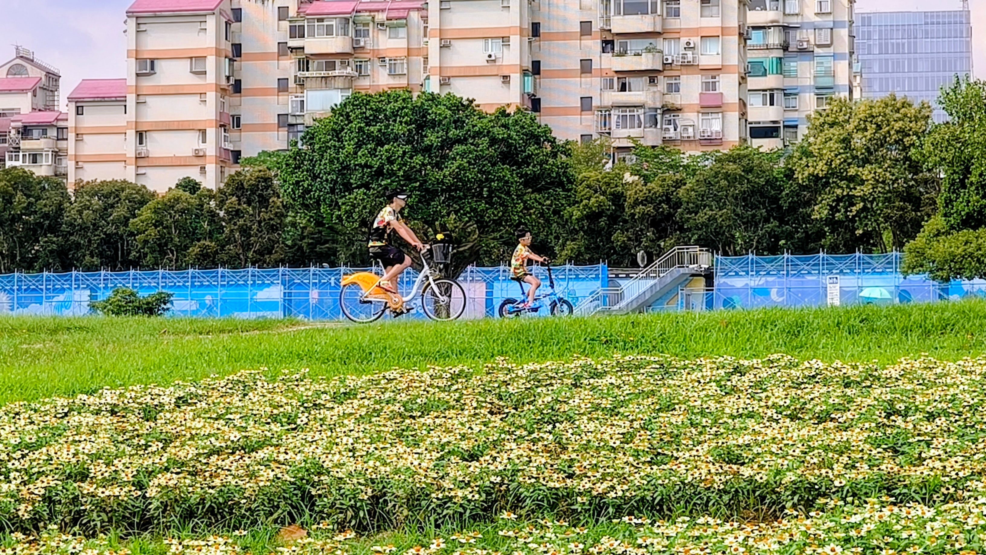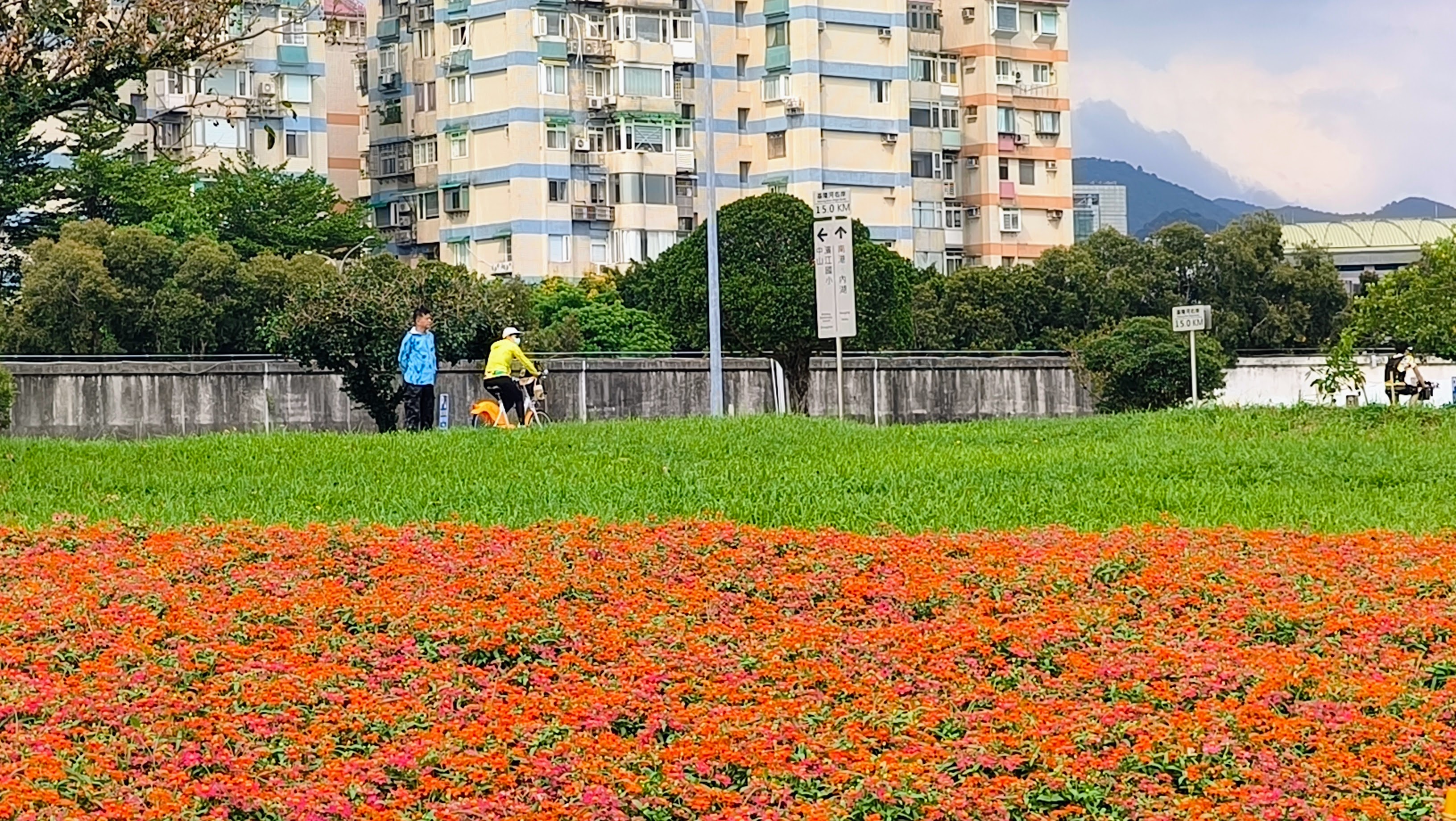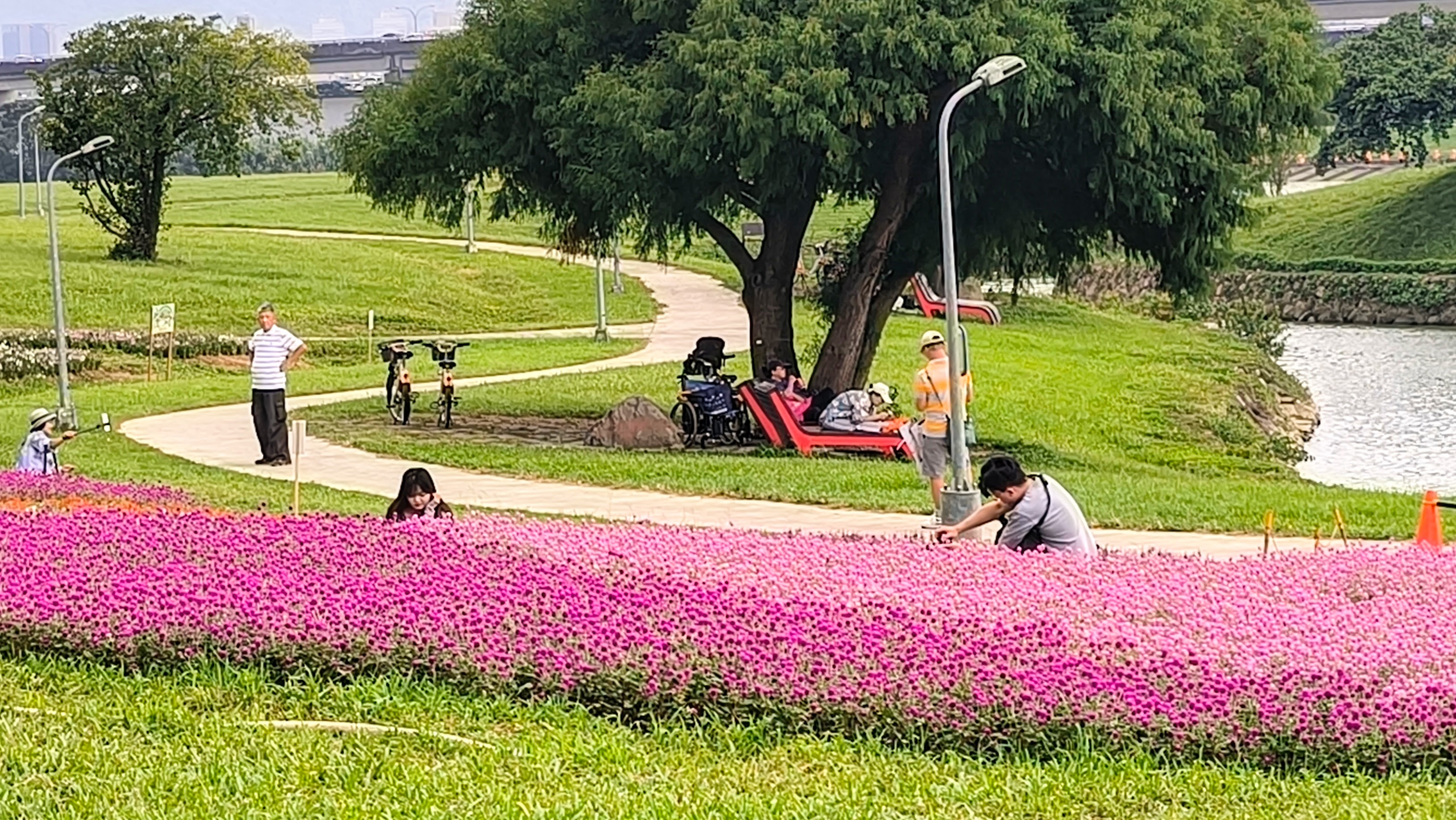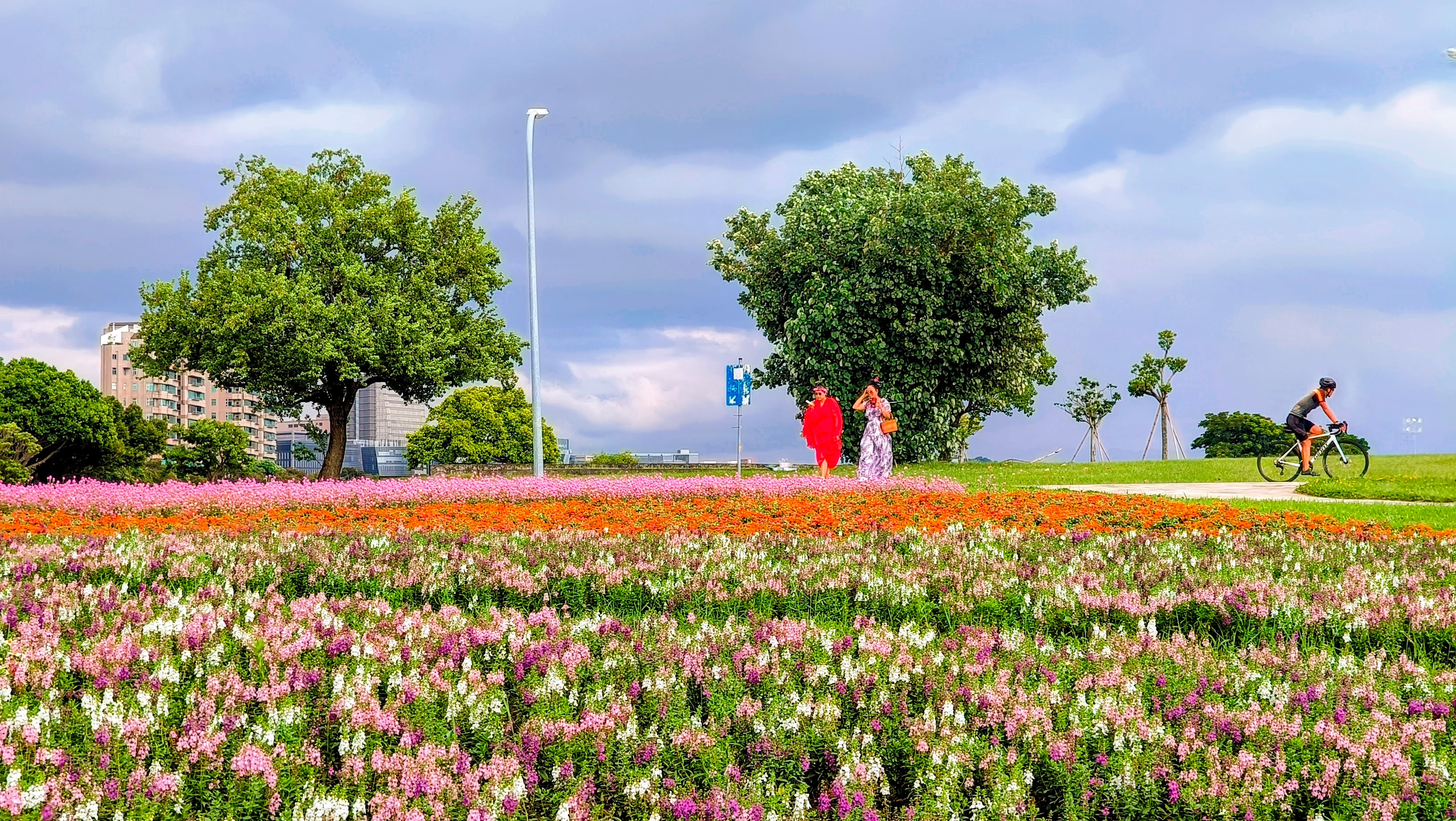 沿著基隆河騎行,我們邊賞花、邊拍照,雙色圓仔花、天使花、百日草鋪陳如漸層花毯。偶爾停下腳步,坐在草坪上,聊聊生活、分享心情,彷彿整個世界都只剩下我們和這片柔和的河畔景色。