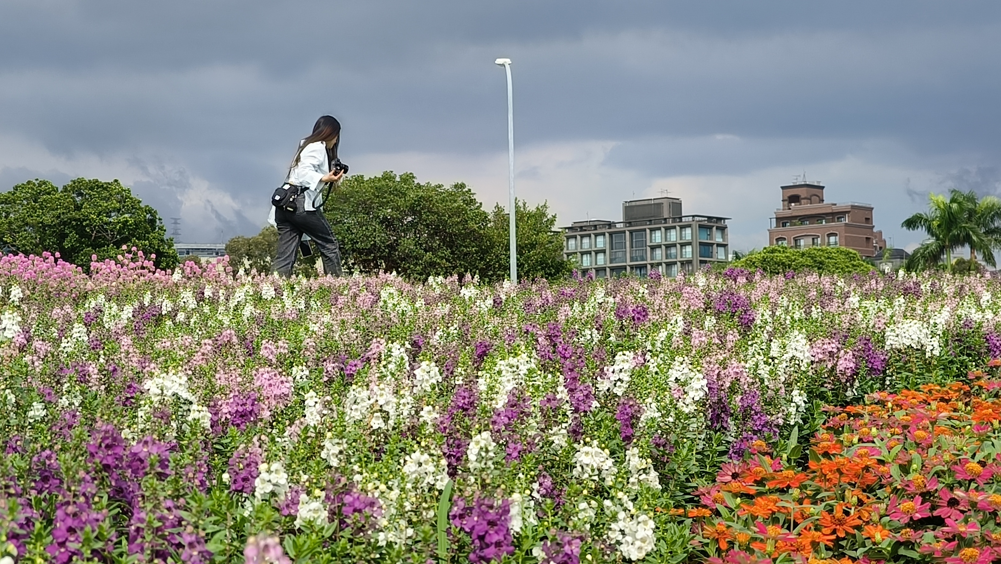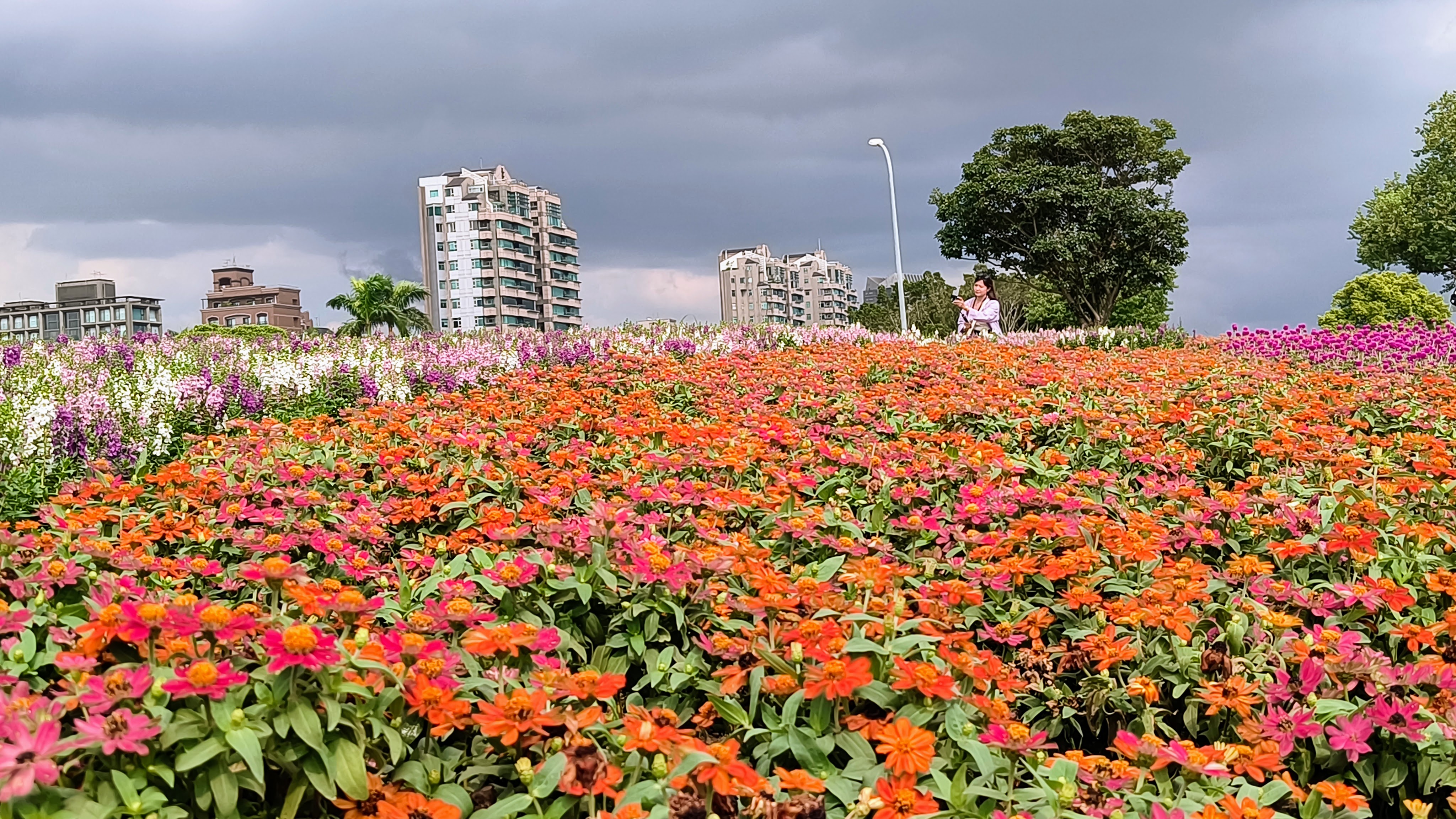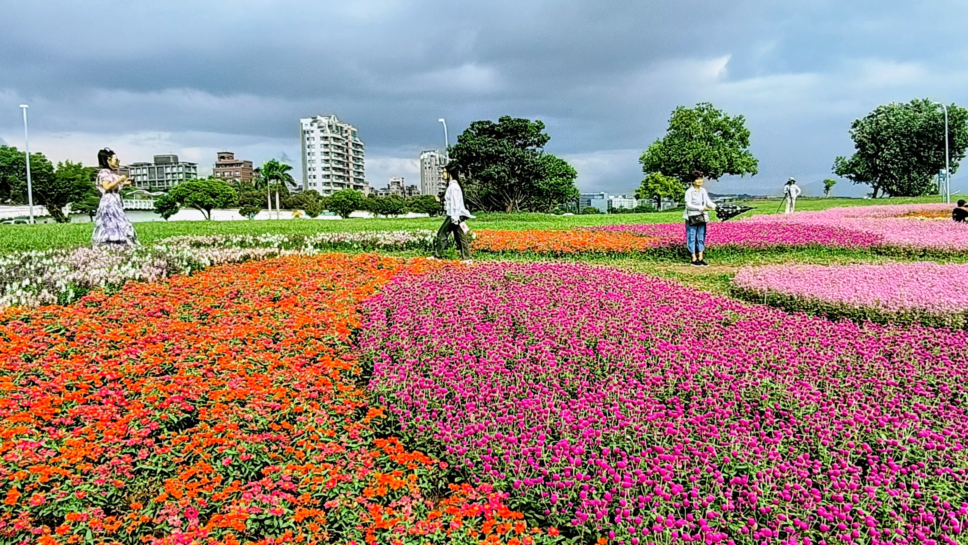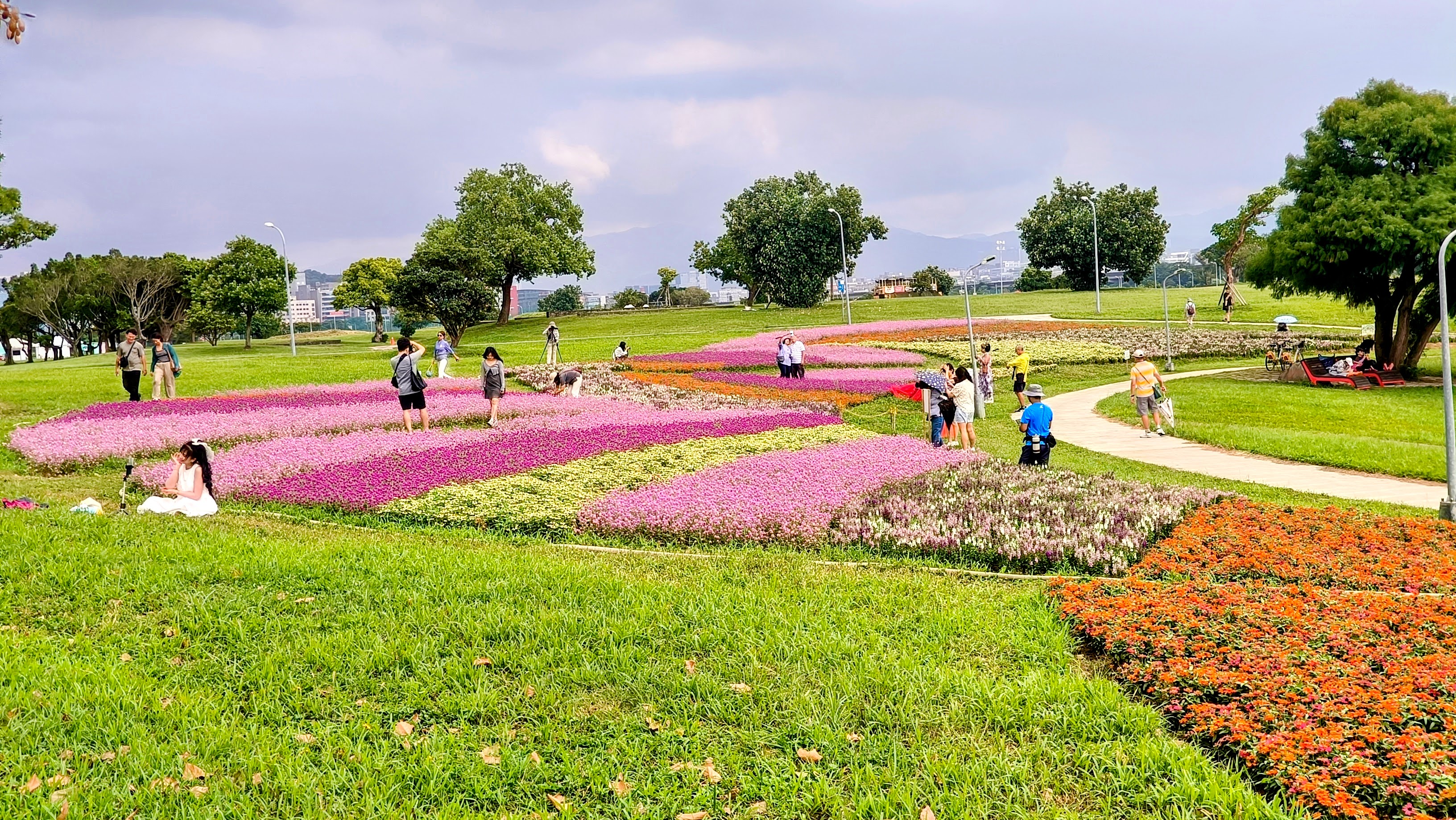 沿著基隆河騎行,我們邊賞花、邊拍照,雙色圓仔花、天使花、百日草鋪陳如漸層花毯。偶爾停下腳步,坐在草坪上,聊聊生活、分享心情,彷彿整個世界都只剩下我們和這片柔和的河畔景色。