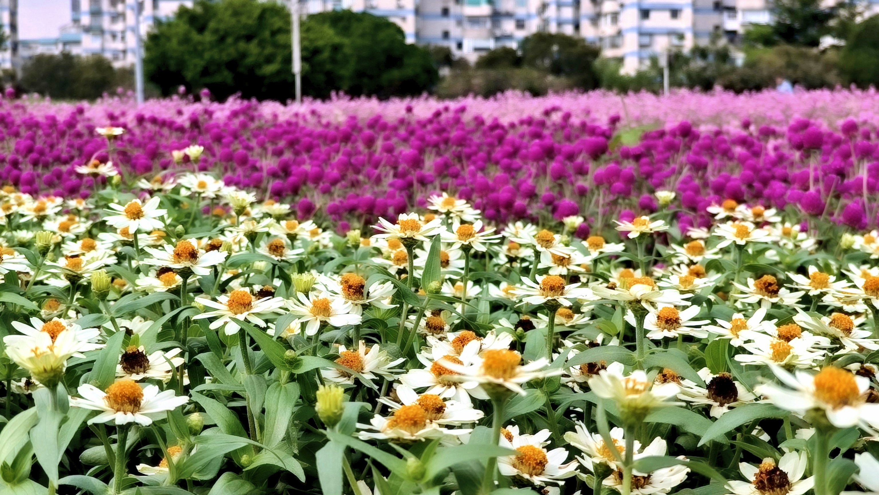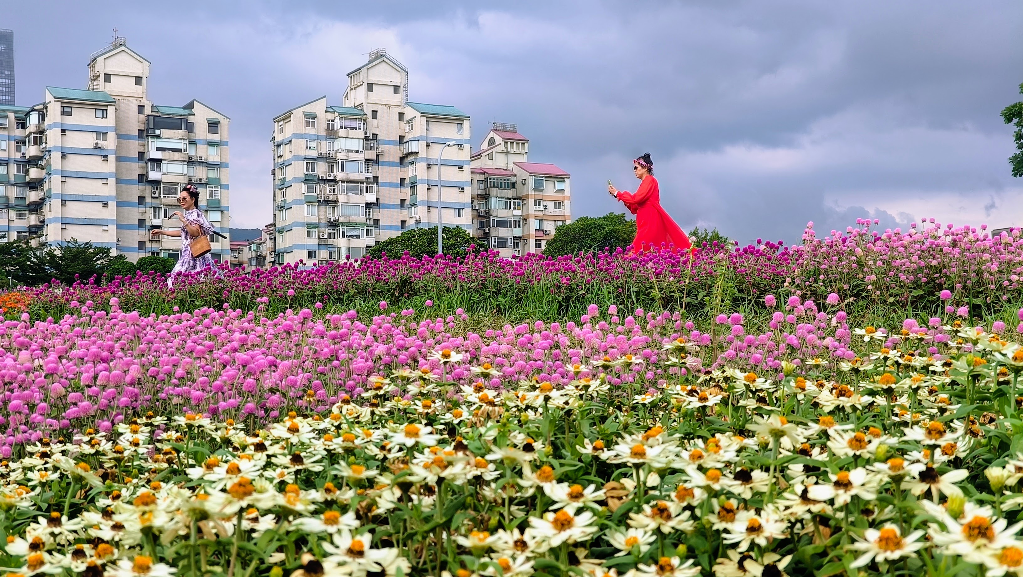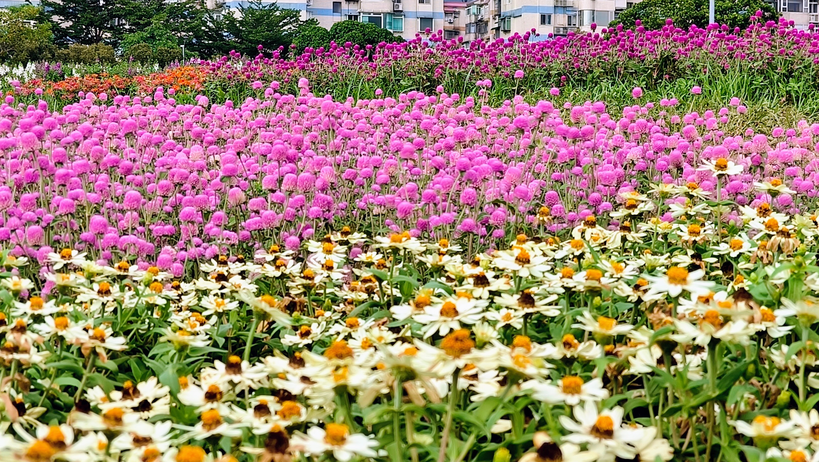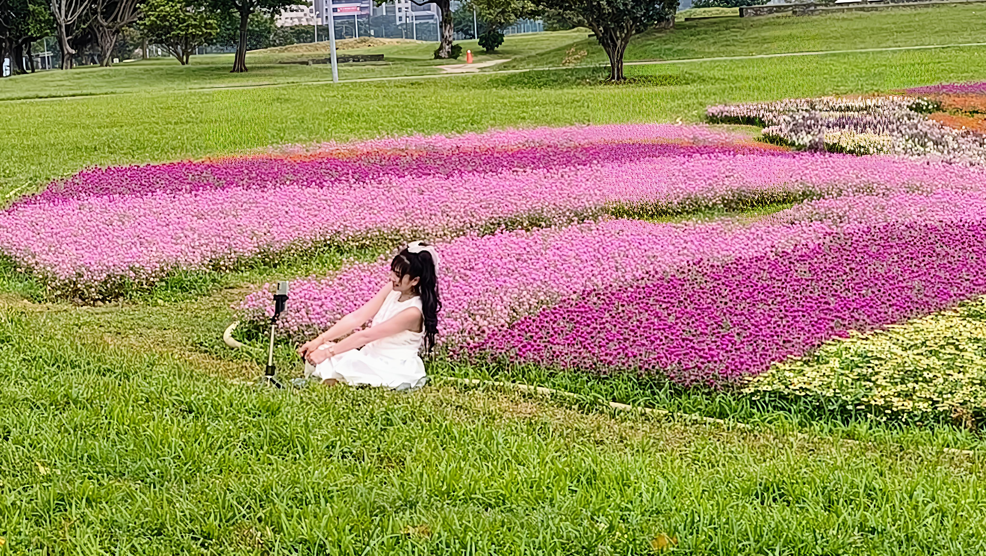 沿著基隆河騎行,我們邊賞花、邊拍照,雙色圓仔花、天使花、百日草鋪陳如漸層花毯。偶爾停下腳步,坐在草坪上,聊聊生活、分享心情,彷彿整個世界都只剩下我們和這片柔和的河畔景色。