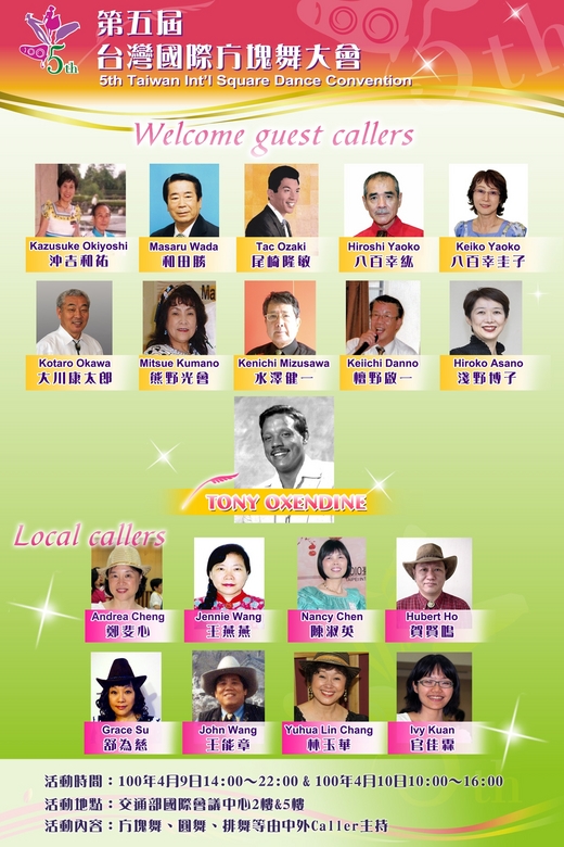 ONE WORLD ONE DANCE is Square Dance, since square dance I have won many close friendship from all over the world, which make my life colorful. Square Dance is a kind of Dance but also a sport and benefit for our health. Hope many Taiwanese could come to join our group and enjoy the greatest Leisure activity in the world.