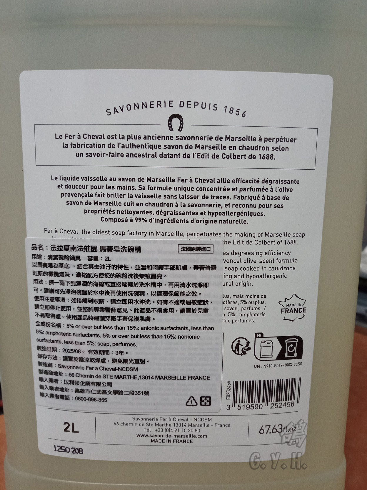 個人對廚房的相關小有潔癖~然後呼吸系統本身過敏對化學得清潔劑比較敏感~找了多年找到的最適合洗碗精就是目前在用的法拉夏馬賽洗碗精~之前有用過另一個一樣法國牌子的馬賽洗碗精但整體上來比較不符合我自己的需求~所以過年前又買一瓶兩公升裝的比較省錢~其實用量很省清潔力強~以一個炒過較油汙的炒鍋大多洗碗精如果以我自己的標準可能要洗個五六次~甚至更多次~當然也可以用其他更去油的產品但有的會傷鍋或是對環境較不友善~用這款馬賽洗碗精大多兩次就解決了~重點是味道不會刺激我自己的敏感呼吸道~天然皂基基本製成對環境也友善~所以目前這款為我主要使用的洗碗精~