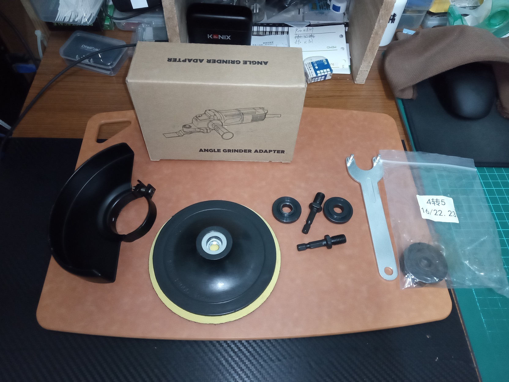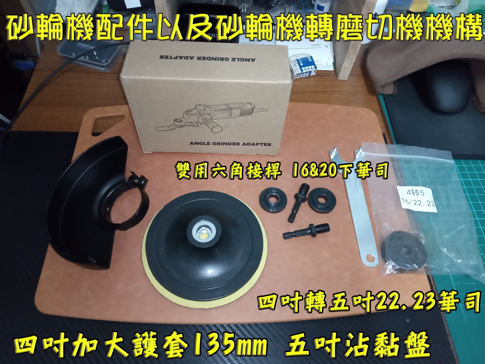 上個月繼續補一些工具相關~首先是砂輪機轉磨切機機構~因為不是專門做相關所以買個轉接機構已備不時之患~另外其他配件也順便補一下~加大版本護套原廠的護套太小110mm以上的就不能用~這個加大版本的裡面約135mm用到五吋切片125mm還有餘裕空間~其他看影片簡介^^