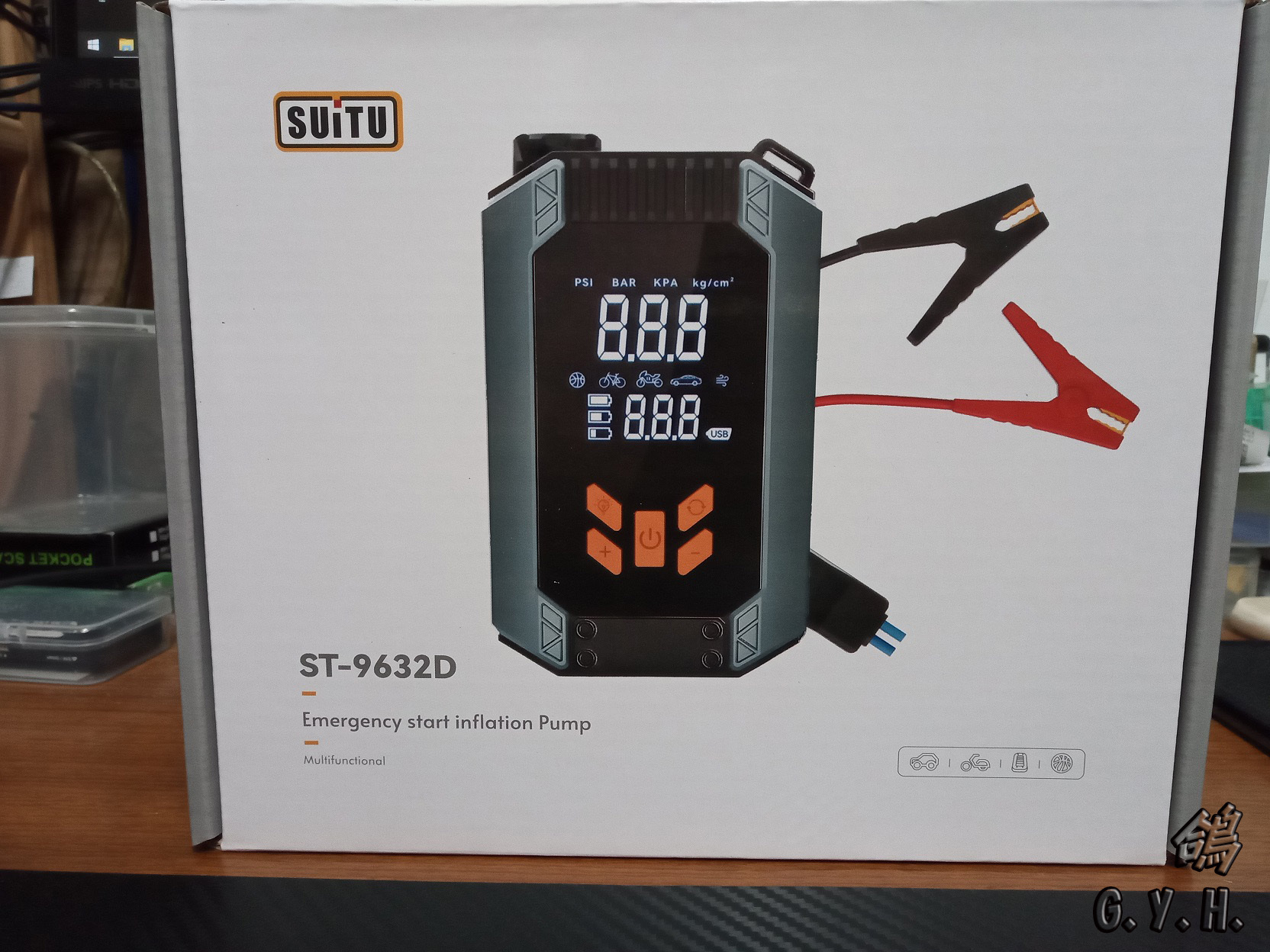 FJ複合式打氣機~功能充氣~手機充電~信號燈照明等~家裡面備一個有備無患~有時輪胎沒氣就可以使用了~外出手機沒電也可以急救充電~汽機車沒電也可以急救發車(汽車一般小型可用幾次詳細看官網)~在外...