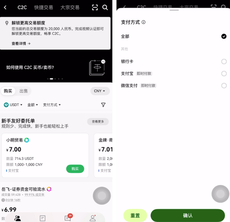 C2C买币也很方便,它支持微信、支付宝、银行卡购买USDT,且风控体系相对完善,能在一定程度上减少受到黑钱导致冻卡的风险。
