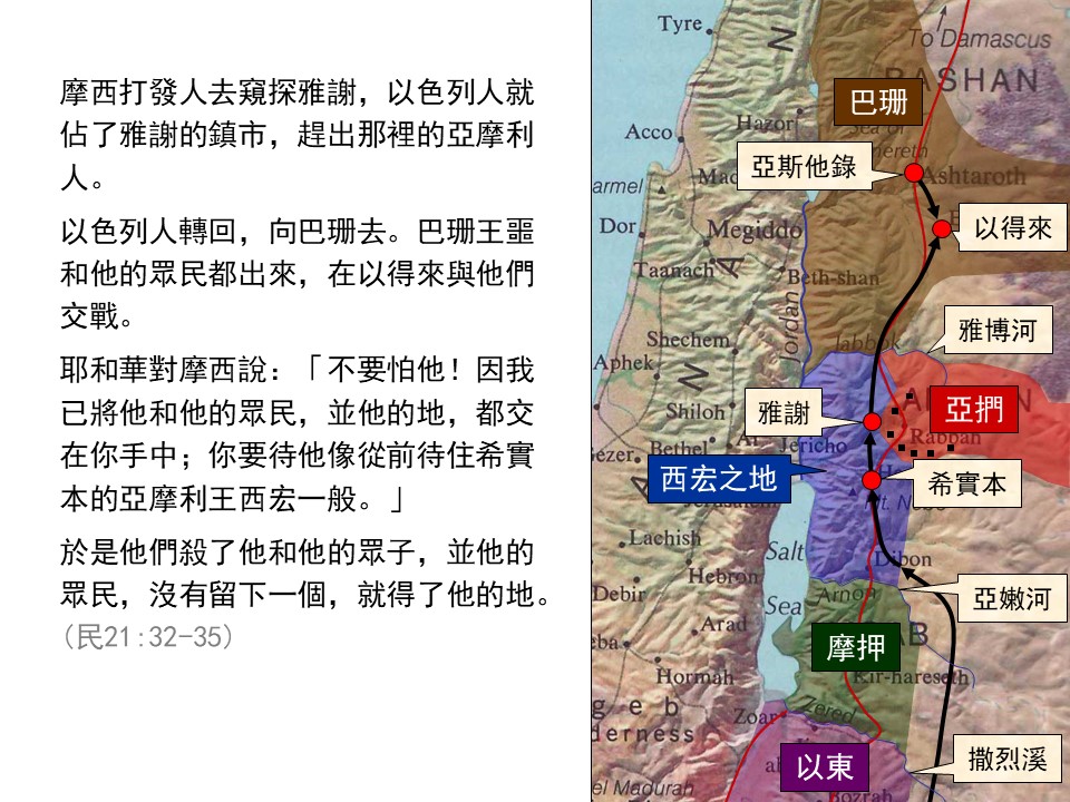 百姓因路難怨讟神,神使火蛇進入民間,咬死許多人。百姓悔改,神吩咐摩西造銅蛇掛杆上,凡仰望者就得活。其後,以色列戰勝亞摩利人與巴珊王噩,得應許之地為業。