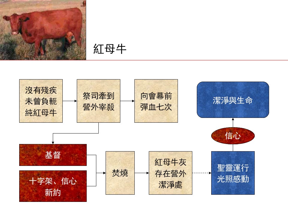 神吩咐摩西預備一隻純紅母牛,燒成灰存留營外,用以調製除罪污之水。凡接觸屍體或不潔之人,需用這水潔淨自己,否則必被剪除。這條例強調聖潔的重要性,甚至潔淨之禮也成為暫時性的贖罪方式。