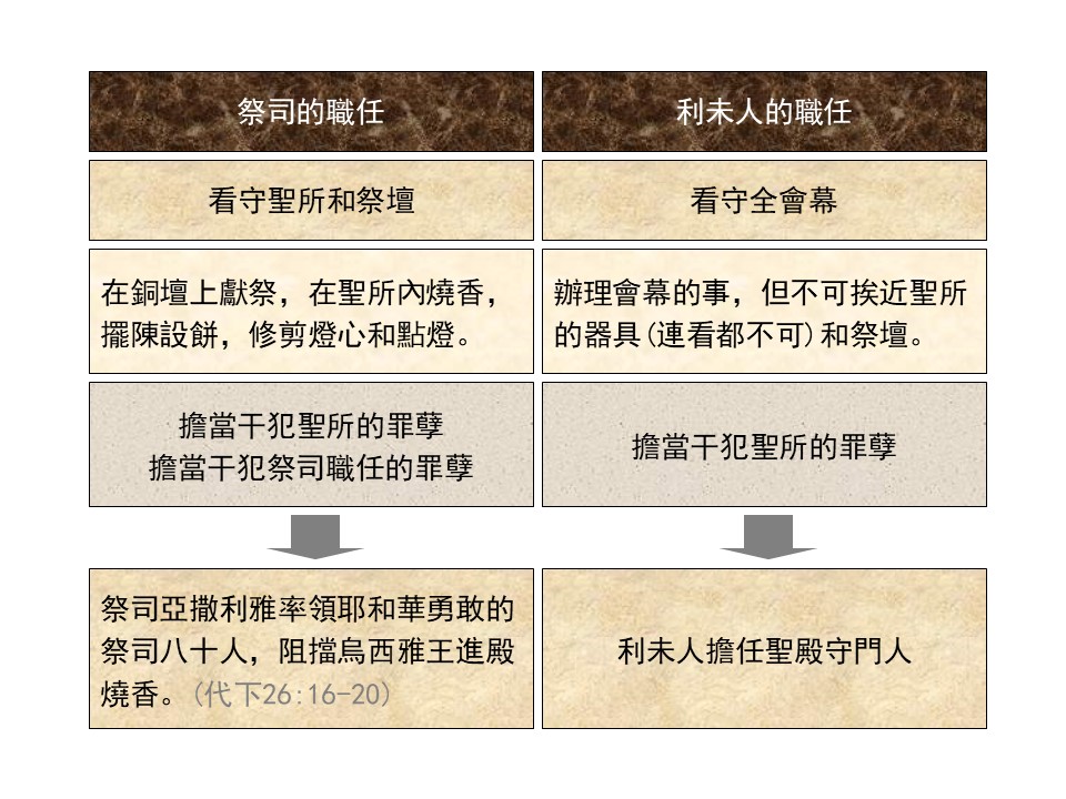 神明確規定亞倫與其子孫承擔祭司的職任,負責聖所與祭壇的事奉,而利未人則協助處理會幕事務,但不可接近聖物,以免死亡。神將以色列人的十分之一賜給利未人為產業,而利未人也要將十分之一獻給祭司。神強調:「我是你的分,是你的產業。」