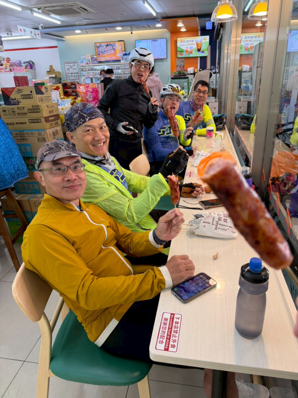 下山後,這次活動的主辦人毓炯學弟還準備了驚喜補給——特地買來陳記現烤的蒜味香腸、飛魚卵香腸,還有香氣十足的鹹豬肉。大家騎完車圍在一起邊吃邊聊天,分享沿途的趣事與騎乘心得。運動後的熱騰騰美味格外令人滿足,也讓大家笑聲不斷。