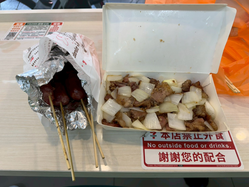 下山後來到三峽山下的小7,品嚐學弟買的超級好吃的香腸及鹹豬肉。