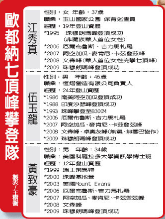 攀登隊長伍玉龍,是台灣第一位登上聖母峰的原住民(布農族),江秀真則是全球第一位完攀七頂峰加上聖母峰南北側都登頂的女性,黃致豪則是第一位登上聖母峰的台籍博士。三名隊員於尼泊爾時間昨晚10點離開標高8,000公尺的第四營,經過近13小時的攀登,伍玉龍在今晨10點21分率先登頂,黃致豪、江秀真隨後抵達,伍玉龍、黃致豪同時也完成七大洲最高峰登頂紀錄。