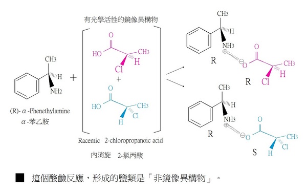 5. 「非鏡像異構物」可以用物理的方法與色層分析技術分離出來;鏡像異構物則是先經過溶解的程序,轉換成「非鏡像異構物」,然後再離析出來。然後,再把離析出來的東西,進行剛才「鏡像異構物」變成「非鏡像異構物」的逆反應,重新製造出反應前的物質(初始物質),提煉出高光學純度的物質。