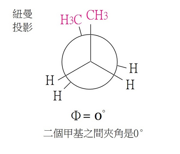 15. 紐曼投影,特別強調取代基彼此在空間相對「夾角」的大小,這對於判斷分子的「立體張力」與「扭張力」會不會影響分子的穩定度,有很大的幫助。