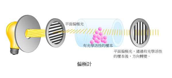 6. 就像光線從空氣穿透水中,會因為物質的密度不同產生偏折。平面光穿過有光學活性的分子之後偏轉,也是一種偏折。