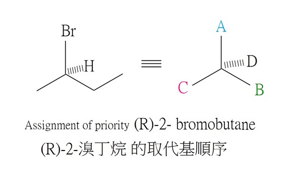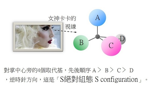 9. 絕對組態以對掌中心與「原子量最小、或長度最短的那個取代基」為軸心,比較其他3個取代基的大小順序,是順時針還是逆時針,分為R組態和S組態。(R是希臘文的「右」意思是指針往右轉,順時針;S是希臘文的「左」,意思是指針往左轉,逆時針。)