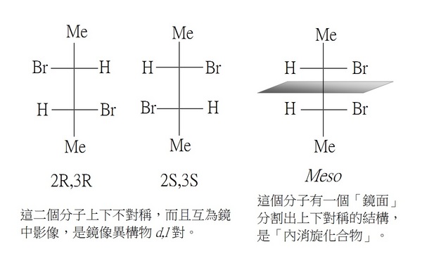 14. 但是有的時候會發生,因為不同的對掌中心的取代基一樣,取代基調整之後變成對稱結構,變成「非鏡像異構物」,稱為「消旋化合物」,例如「2,3-dibromobutane」的消旋化合物(參考第10點的圖),計算多重對掌中心的分子有多少「鏡像異構物」的時候,要扣掉「消旋化合物」的數量。