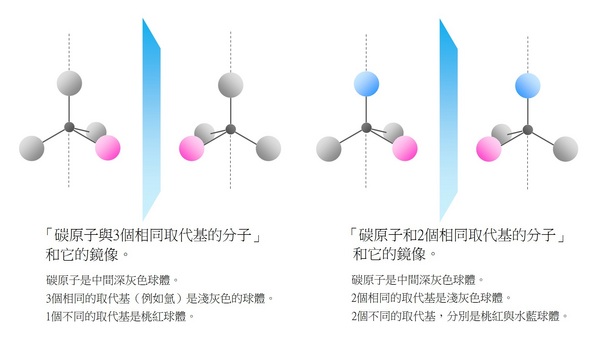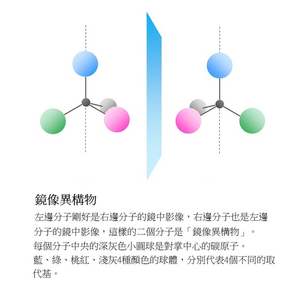 「對掌性chirality」分子,是指左右不對稱的分子,我們無法找到一個「鏡面」,能把分子剖成一模一樣的兩半。