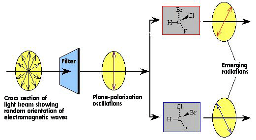 7. 科學家觀察到成對的鏡像異構物分子中,一種會讓平面光往左邊偏轉,另外一種會讓平面光往右邊偏轉,因此分為「左旋光」分子與「右旋光」分子:正異構物(+)和負異構物(-)或右旋d和左旋l。這種分類是以用觀察者的經驗來做的分類,稱為「相對組態relative configuration」。