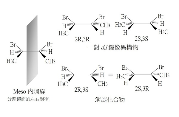 9. 立體異構物,有對掌中心與分割出對稱的兩側的鏡面,無光學活性,稱為「內消旋化合物meso compound」。