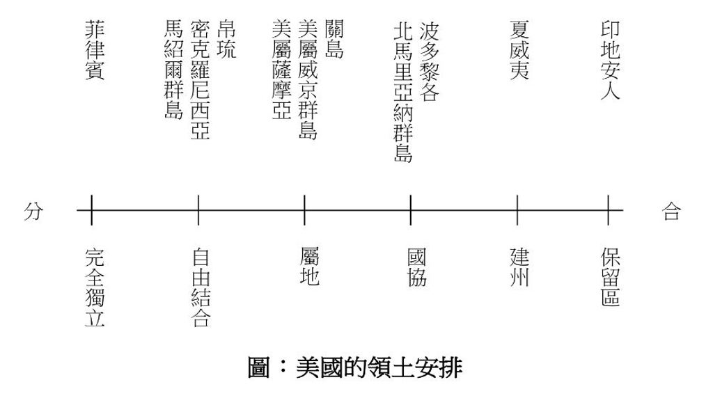北馬里亞納群島原本是西班牙殖民地,後轉手德國,日本在一次大戰後攫取,美國在戰後取得聯合國授權託管,最後納為屬地,名義上是國協(commonwealth),住民具有美國公民權、不能投票選總統,只能選出一位沒有投票權的代表到眾議院。波多黎各是美西戰爭後納入,地位跟前者相仿,多次公投未決,想要建州緣木求魚,卻提供一些台派的玄想空間。