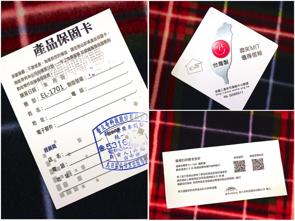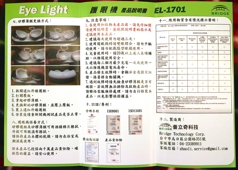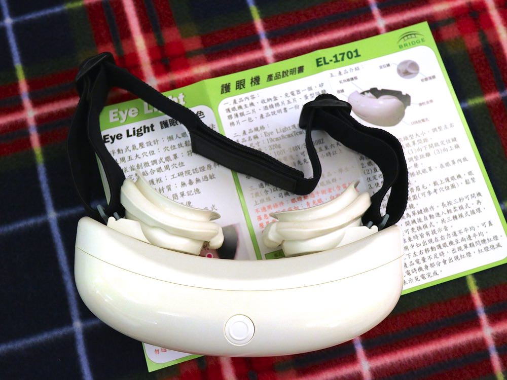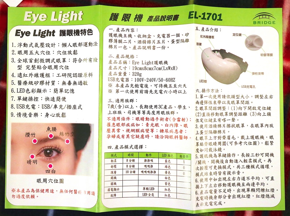 官網說明:《Eye Light 隨身型護眼機/眼部按摩器》為唯一台灣設計、台灣製造、台灣發明專利,通過標準檢驗局『最新安全安規認證』,微動式眼罩-完整包覆眼周穴位,透過正負氣壓&遠紅外線,進行眼周穴道按摩,幫助雙眼放鬆舒壓。