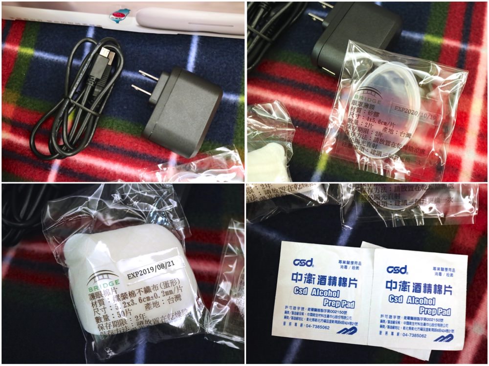側面小袋裡放著相關配件:充電器、眼罩薄膜(替換備品)、護眼棉片(替換備品)、酒精棉片(消毒用)