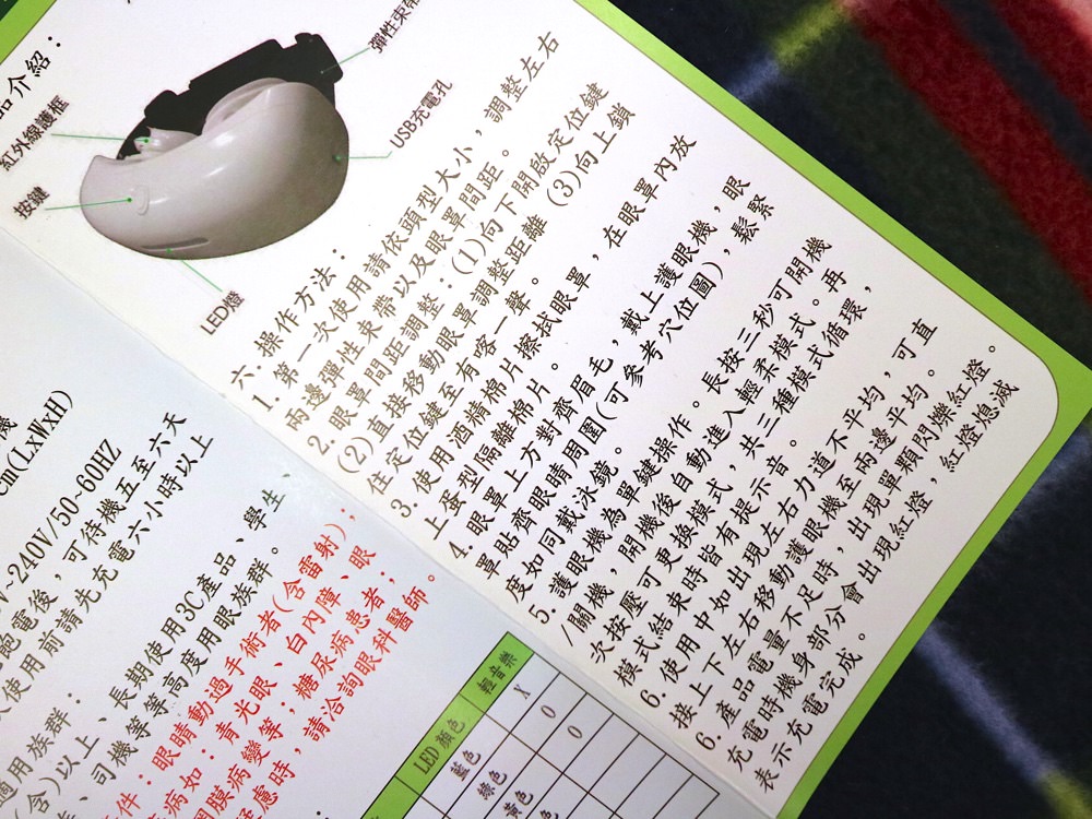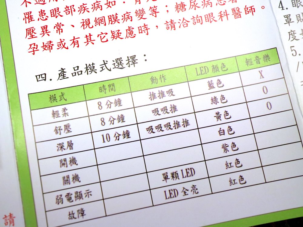對了!比較特別的是,說明書有交代這護眼機使用時的姿勢,最好是坐著,而不是躺著!(好險它有寫,不然我本來真的天真以為可以睡前躺在床上給它按摩,我就一邊進入夢鄉 XD)