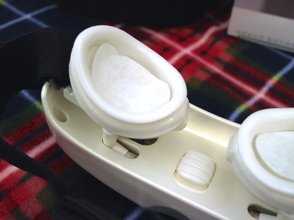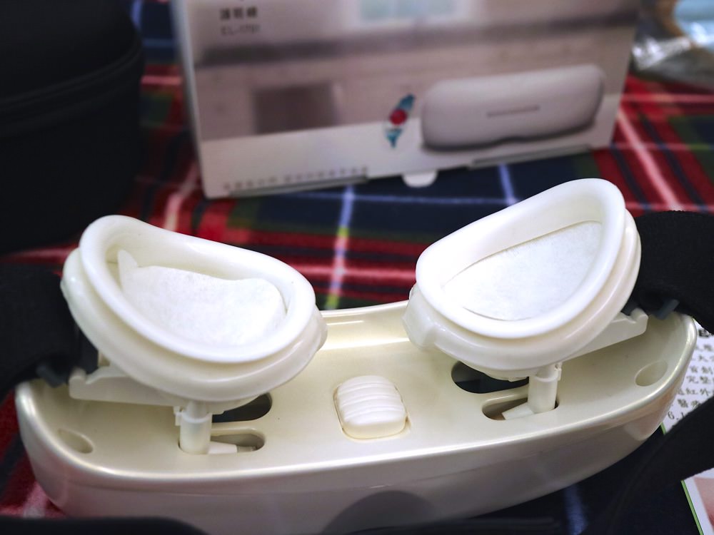 護眼機的眼罩,就像泳鏡一樣!戴上時,就要像泳鏡一樣,讓它貼緊眼周皮膚(不要有空隙,一有空隙負氣壓就會沒有作用)。(我會輕按一下,確定眼罩密合、包覆與貼緊整個眼眶)