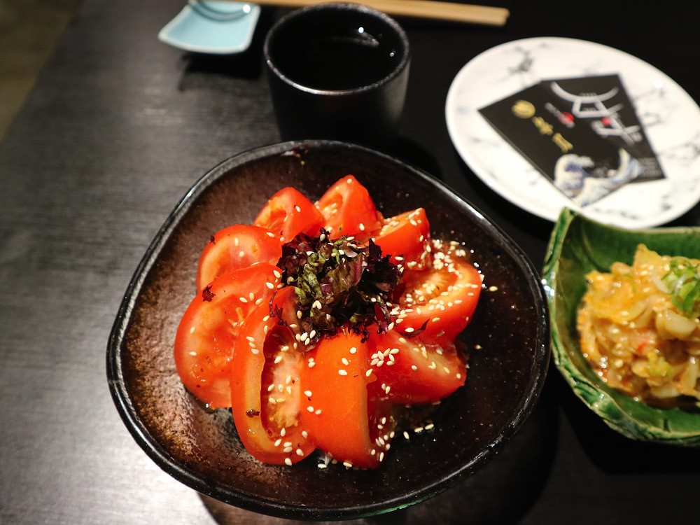 《柚子番茄沙拉》,有鮮甜冰涼的番茄切片,搭配酸酸甜甜的特調柚子醋,上方還有紫蘇葉,真的好好吃~
