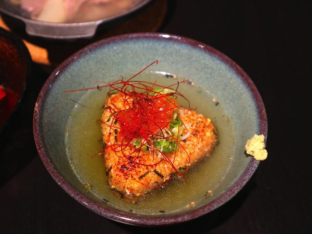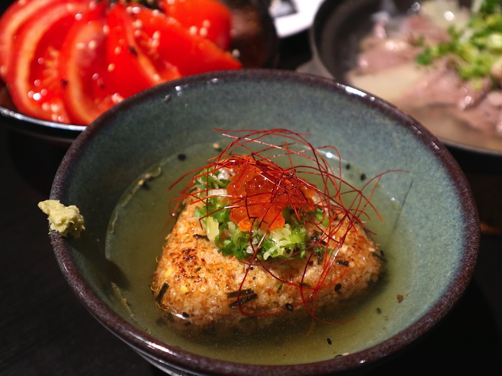 《鮭魚卵湯飯糰》把烤飯糰炸到金黃焦香,再沖日本柴魚高湯,上方點綴了 顆顆橘紅剔透的鮭魚卵,美極了!