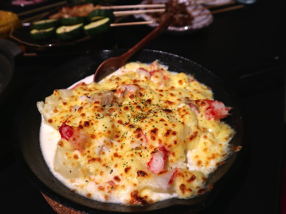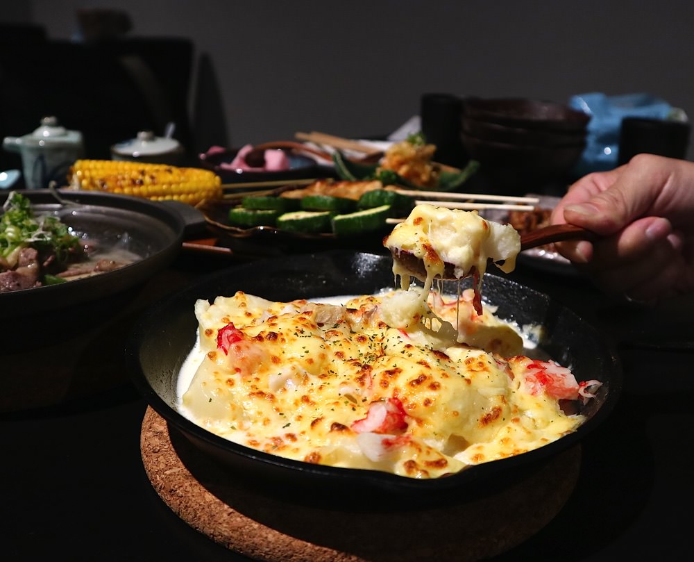 《明太子漁夫洋芋燒》有著金黃牽絲的焗烤起司