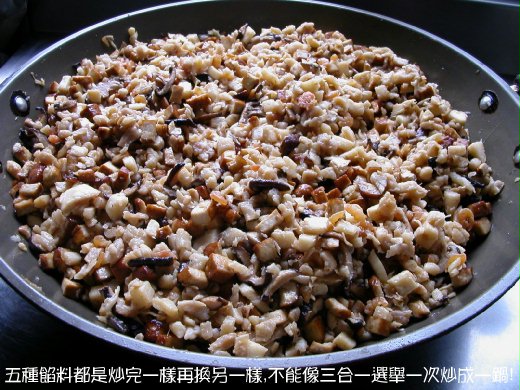 整個包粽子最繁瑣累人的地方就是前置作業的準備,諸如煮粽葉,洗粽葉(洗粽葉已有小古董代勞了)和準備餡料的過程,古董的肉粽餡料一共五種,都是炒完一樣再換炒另一樣,千萬不能像三合一選舉那樣一次炒成一鍋,否則炒不出味道,炒完全部再彙整炒成一鍋。