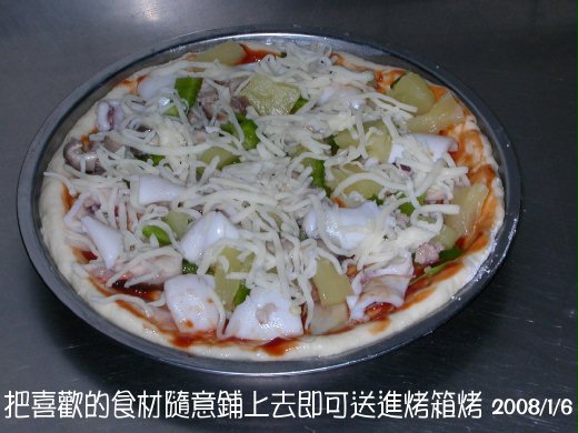 洋蔥絲、鳳梨丁、青椒、蘑菇、蝦仁或墨魚、培根、絞肉(培根、絞肉我會先炒熟)這些都是固定元素,當然您也可以就您家裡冰箱剩下的食材,看是鮑魚、鮪魚.....等等只要能吃的,都可以拿來當餡料。以上食材準備好後鋪上去烤盤烤至表面金黃色即可。簡單吧!