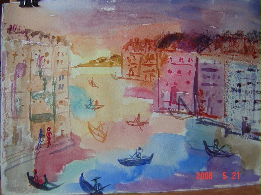 試圖以水彩模仿廖繼春威尼斯1967油畫像,廖繼春實驗畫了2張(粉紅色調以及藍色調),我也先後模仿但是更簡鍊。回溯起來,廖繼春此時是模仿Dufy,所以我盡量掌握Dufy的技巧:薄塗,以及底色和物體色同一顏色,只以黑色線條勾勒物體外型。