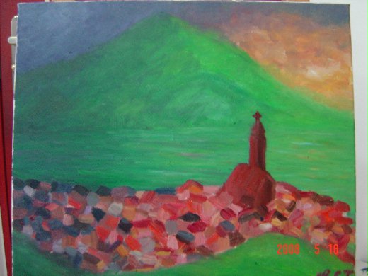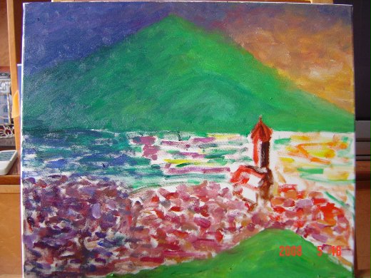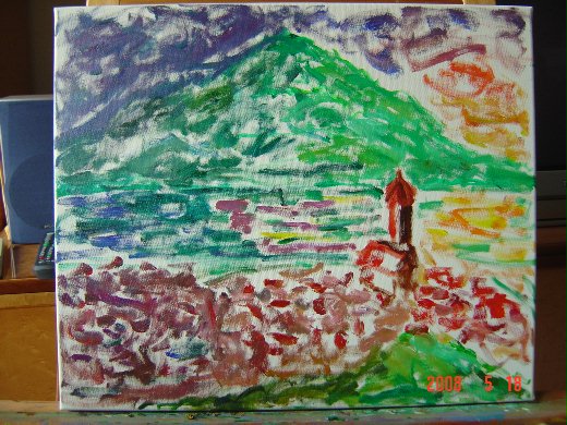 第一張是首先鋪『大關係』(龐均用語,指的是追求物體之間的相互色彩關係是否協調),我要表達的是從小山坡上俯看小鎮,對岸觀音山太陽下山之情景。剛開始是以野獸派之手法著手鋪『大關係』,自覺明暗與對比很強烈,還算協調。