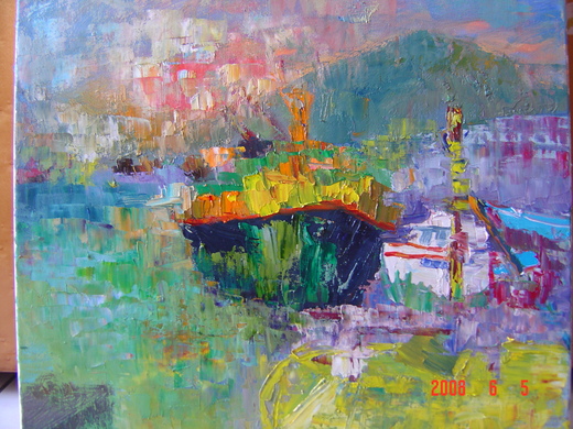 同樣地,林顯宗的船畫法對我影響很深,所以一半臨摹之而產生此作。