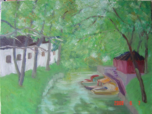 3年前曾經造訪蘇州,把當年照片拿出來看,發現蘇州的景色很適合畫,其特色有運河,船,黑瓦白屋,總體有股抒情悠閒的氣氛,是其他風景區所沒有的。所以畫家不見得要畫義大利威尼斯,也可畫東方威尼斯