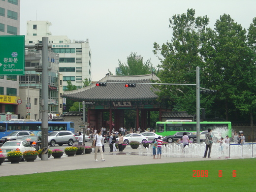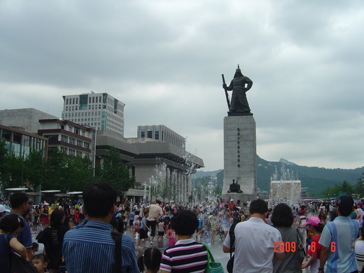 最後, 終於到了光化門, 馬路中間增設了噴水池,在忠武公李將軍銅像前 許多小朋友在戲水.
