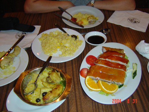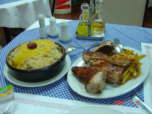 葡國烤豬的特點和巴里島烤豬 ( 印尼文 Babi Guling, 英文 Balinese Roast Pork) 一樣,皮脆的程度是中等、油比較多,但是葡國稍微嫌了一點,但是肉比較多,所以照片上可以看到是切比較大塊在吃的。飯是另外點,我記得是炒馬介修飯來的。馬介休是一種魚類,是鱈魚 (codfish) 經鹽醃製而成 ,所以拿來炒飯鹹鹹的還不壞,有廣式鹹魚雞粒炒飯的味道,但是味道沒那麼臭,台灣吃不到正統鹹魚雞粒炒飯,那是一桌點滿室臭。