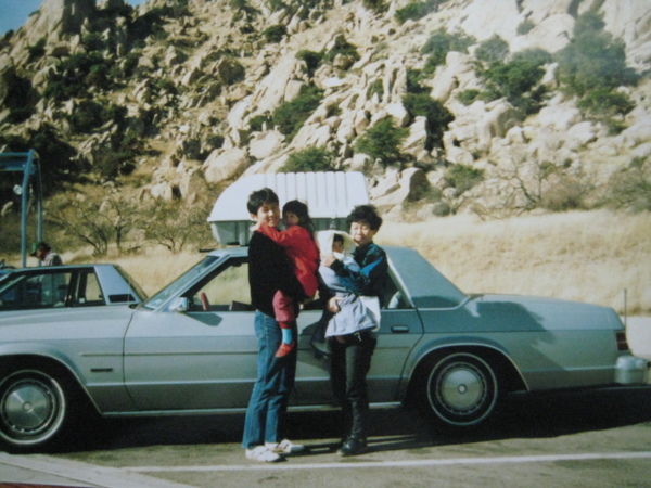 拿到學位後決定到加州求發展,於是賣掉 Citation,一家四口(此時小兒已在德州出生)開著 Newport 沿國道十號、州道一號來到聖荷西。還是那頂漢堡箱曁全副家當。照片裡抱兒子的是我母親。